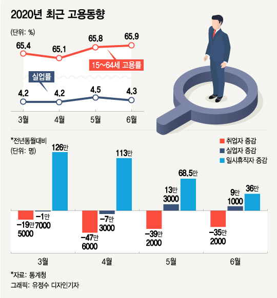 취업자로는 분류되지만 1달 근무 시간이 0시간인 '일시휴직자'는 지난해 같은 기간보다 97.7%(36만명) 늘어난 72만9000명을 기록했다. 정동명 국장은 "코로나 영향으로 대면서비스 등에서 일시휴직자가 늘어났지만 지난 5월에 비해 증가폭은 100만명대→70만명대로 줄었다"면서도 "줄어든 일시휴직자가 비경활인구 또는 실업자 등 어디로 갔는지는 정확히 파악하기 어렵다"고 말했다.