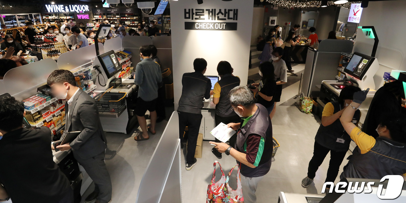 (서울=뉴스1) 김진환 기자 = 16일 서울 마포구 이마트 신촌점을 찾은 고객들이 장을 보고 있다.