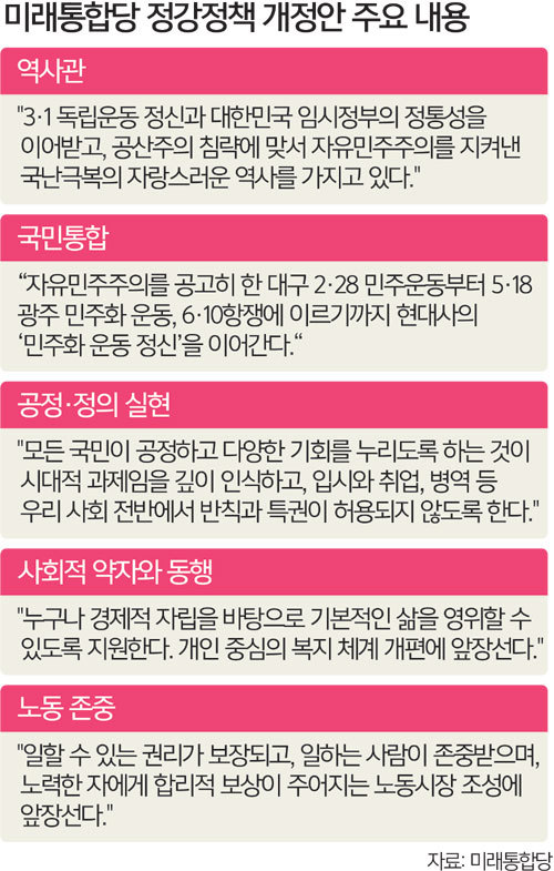 구체적인 가치로는 △3·1운동과 자유민주주의 수호의 역사관 △민주화·산업화 가치를 동반한 국민통합 △미래 변화와 혁신 △공정과 정의 실현 △사회적 약자와 동행 △노동 존중과 노동자 권리 보장이 새로운 정강에 담겼다.