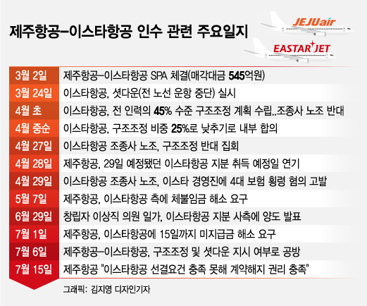 이스타항공 한 관계자는 "그나마 25% 구조조정에 제주항공과 합의한 다음날인 22일 이스타항공 조종사노조가 민주노총에 가입하며 구조조정 반대 집회를 열었다"며 "당초 4월말까지 인수를 마무리 할 방침이었던 제주항공이 이때부터 인수합병 의지가 꺾인 것으로 안다"고 말했다.