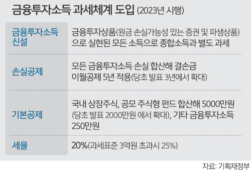정부가 지난달 발표한 초안에서는 금융투자로 1억원의 이익을 남기면 그중 2000만원을 공제하고 8000만원에 20% 세율을 매기는 것이었는데, 이날 발표에서는 기본공제를 5000만원으로 확대했다. 1억원의 이익을 남기면 5000만원을 제외한 나머지 5000만원에만 과세를 한다.