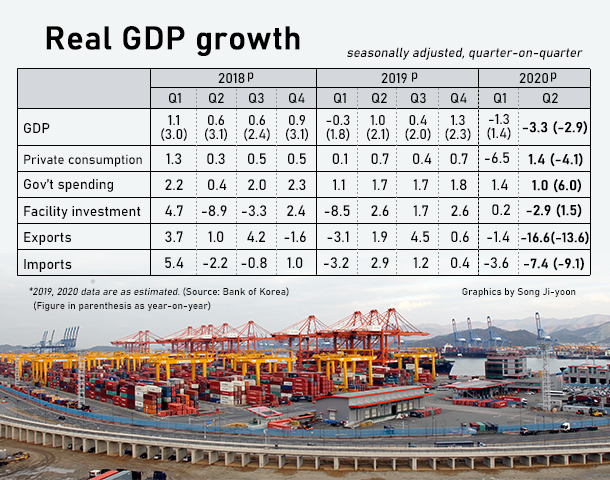 The second-quarter negative was greater than “more than 2 percent” the BOK projected a few months ago when it suggested the economy was headed for the first annual contraction since the wake of the 1997 Asian financial crisis.