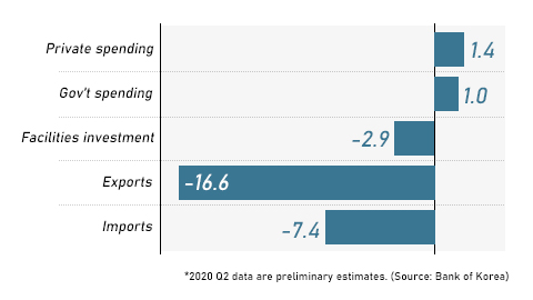 Lockouts and slack economic activities across the world amidst the pandemic peak dealt heavily on demand. Exports that contribute largely to GDP plunged 16.6 percent on quarter and 13.6 percent on year. The yawning double-digit negative figure was the largest since the 24 percent plunge in the fourth quarter of 1963, BOK said.