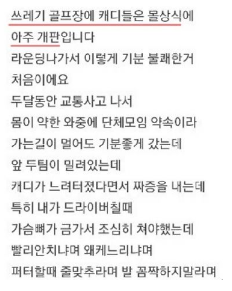 한편 23일 한국경제의 단독 보도에 따르면 A씨는 경기 진행을 돕던 캐디가 면전에서 "느려터졌네"라고 말하고, "왜 이렇게 하냐, 그게 아니라 이런 식으로 하는거다"라고 고함을 치면서 감정을 상하게 했다고 반론을 제기했다. 이어 "전 제대로 된 사과도 듣지 못했는데, 일방적으로 욕만 먹게 됐다"며 "정말 어떻게 해야 하냐"고 호소했다.
