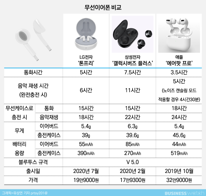 나름대로 최신 출시된 무선이어폰을 비교해보겠다며 지인들에게 '갤럭시버즈 플러스'와 '에어팟 프로'를 빌려 들어봤다. 하지만 막귀에게는 쓸데없는 노력이었다. 특히 조용한 공간에서 집중해서 음악을 감상하는 게 아니라면, 길거리에서 혹은 카페에서 음악을 들을 때는 음질 차이를 분별하기는 어려울 듯 했다./사진=백유진 기자