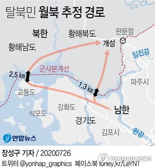 (서울=연합뉴스) 배영경 정빛나 기자 = 군 당국이 26일 남측 '일부 인원'의 월북 가능성을 공식 인정하면서 그의 신원과 월북 방법, 경로 등에 관심이 쏠린다.