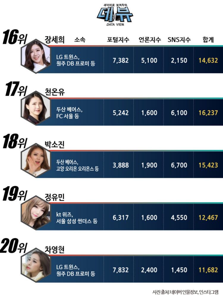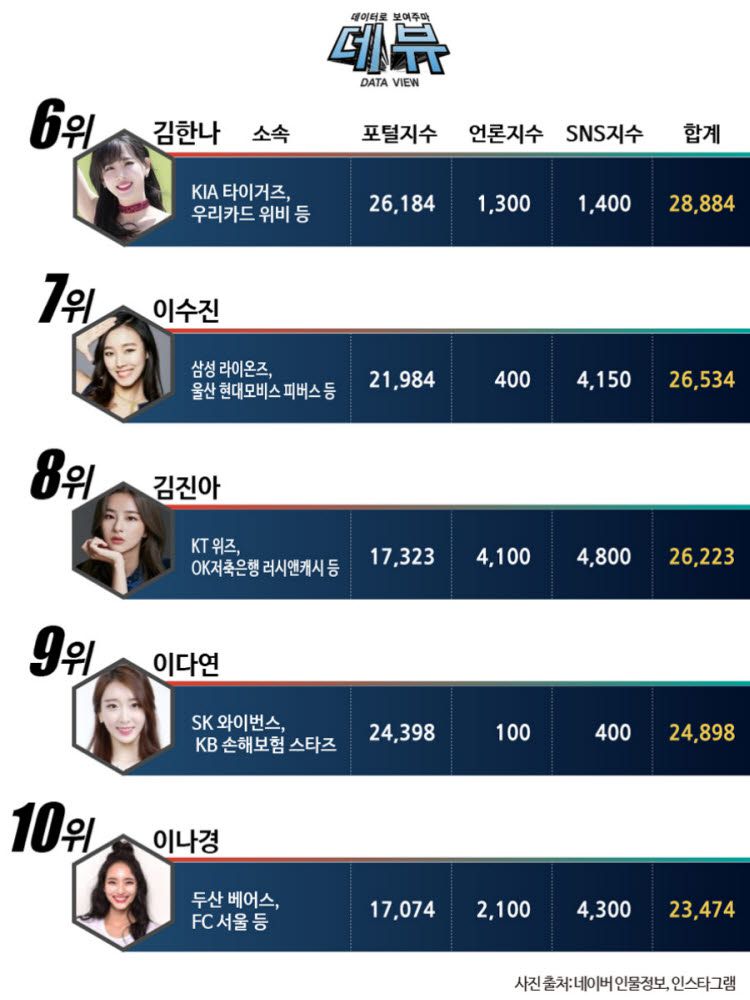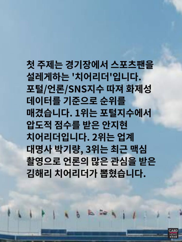 어느 분야에나 최고는 있습니다. 다만 가리기 쉽지 않을 뿐. 호감도·인상·팬심 등 주관적인 부분을 제외하고 명확한 데이터로 최고를 가려볼까 합니다. '데이터로 보여주마' 데뷰 시작합니다. 첫 주제는 경기장에서 스포츠팬을 설레게하는 '치어리더'입니다. 황정우기자 hwangjw@etnews.com 장준석기자 gbjjs@etnews.com [Copyright © 전자신문. 무단전재-재배포금지] 이 기사의 카테고리는 언론사의 분류를 따릅니다.0공유하기