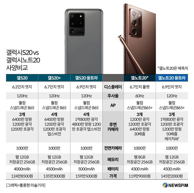 이번 가격은 전작인 갤노트10 시리즈보다 낮다. 갤노트20은 갤노트10(124만8500원)보다 4만9500원, 갤노트20 울트라는 갤노트10 플러스(139만7000원)보다 무려 14만8500원이 싸다.