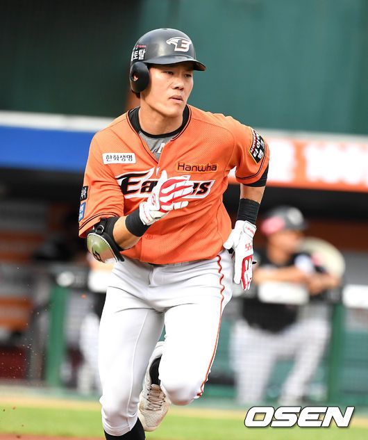 [OSEN=대전, 지형준 기자]1회말 2사 1,2루에서 한화 강경학이 선제 1타점 적시타를 날리고 1루로 향하고 있다. /jpnews@osen.co.kr |