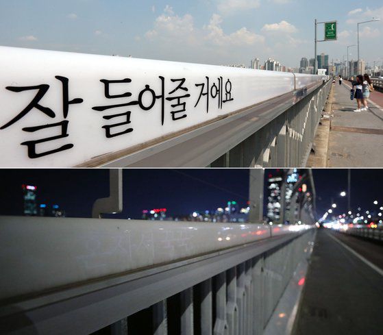한강대교 난간에는 성악가 조수미, 배우 하정우, 가수 이효리, 체조선수 손연재 등 유명 인사들의 문구도 함께 적혔다.