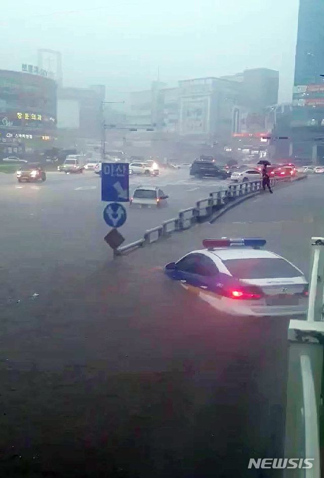[천안=뉴시스]이종익 기자 = 3일 충남 천안과 아산에 집중호우경보가 발효된 가운데 천안 삼일아파트 인근 충무로 사거리에 경찰차를 비롯해 차량들이 침수돼 있다. (사진=독자 제공. 영상 캡쳐) 2020.08.03.photo@newsis.com |