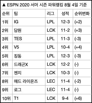 ESPN은 4일(이하 한국시간) 2020 서머시즌 7번째 LOL e스포츠 프로팀 파워랭킹을 공개했다. 이번 랭킹에는 많은 변화가 있었다. 6주 연속 1위를 유지했던 TES가 처음으로 자리를 내줬다. ‘LOL 프로 리그(이하 LPL)’에서 7연승을 질주하고 있는 IG가 1위에 올라섰다. ‘LOL 챔피언스 코리아(이하 LCK)’의 맹주 담원은 2위로 그 뒤를 바짝 쫓았다.