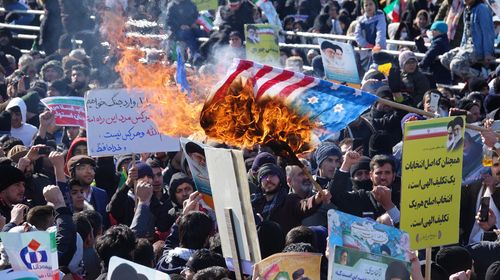올해 2월 이란 이슬람혁명 행사에서 성조기가 불타고 있다[테헤란=연합뉴스. 재판매 및 DB 금지]