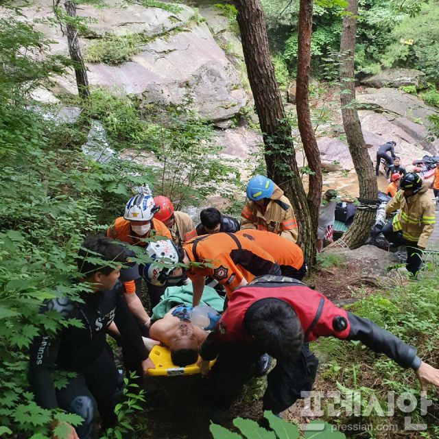 ▲지리산 문수리 용소폭포에서 물에빠진 피서객을 구조대원들이 ㅂ병원으로 이송하는 모습 ⓒ프레시안