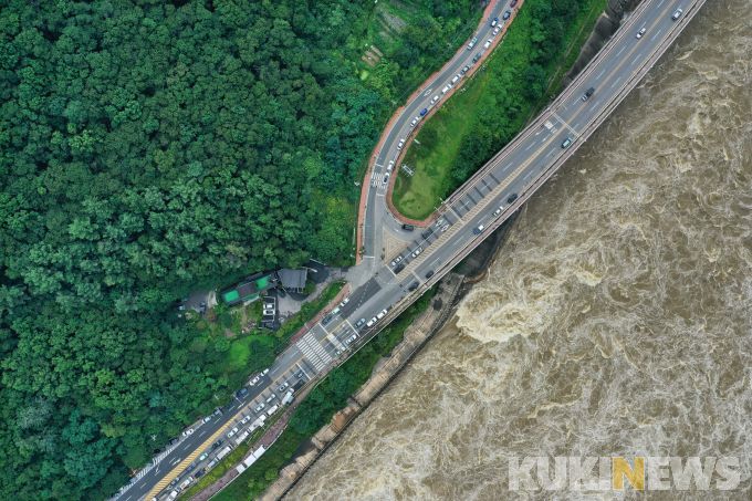 [쿠키뉴스] 하남· 곽경근 대기자= 장맛비가 잠시 주츰했던 4일 오후, 하남시 방향 팔당댐 삼거리를 지나는 시민들이 차를 세워놓고 가드레일에 인근에서 사진촬영에 분주하다. 방송과 신문사 차량들도 도로 한편에 줄지어 서있다.