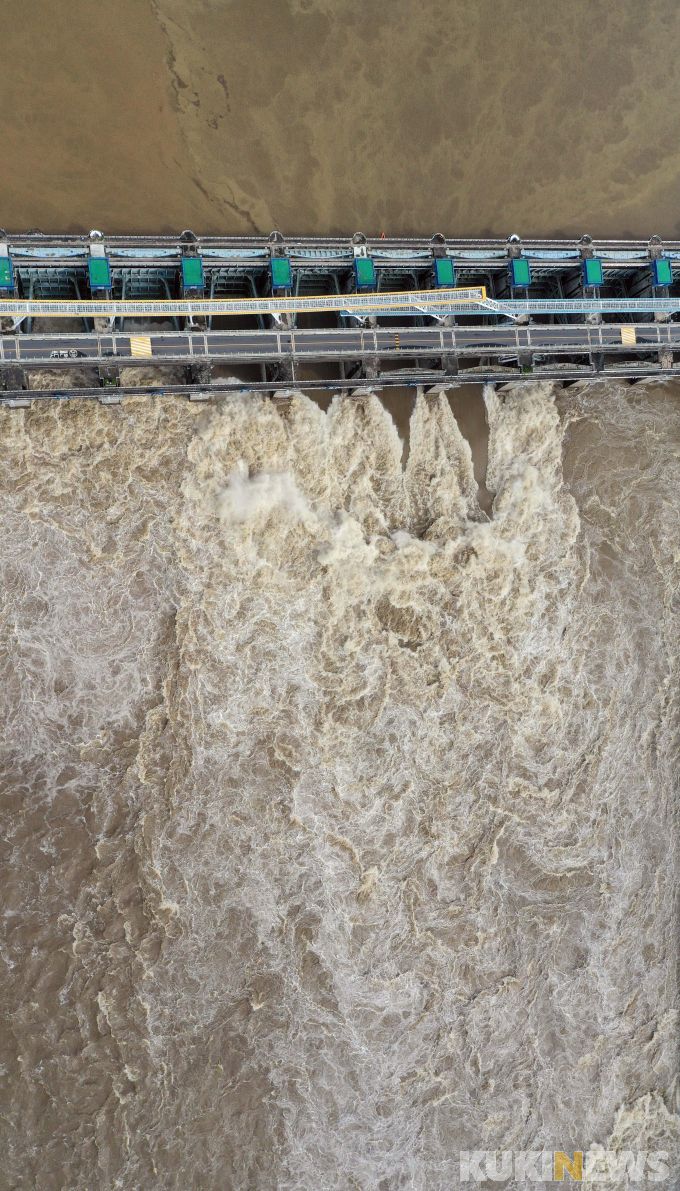 주변이 차량으로 혼잡하자 경찰차량은 연신 경광등을 켜고 사이렌을 울리며 불법주차 차량을 이동시키기에 분주하다. 겨우 타 방송사 차량 사이를 곡예 운전하듯 비집고 들어가 억지로 차를 세웠다. 취재 장비를 챙겨서 댐 가까이 접근하자 굉음과 함께 누런 흙탕물이 포말을 일으키며 쏟아져 나오는 모습이 보는 이를 압도한다.