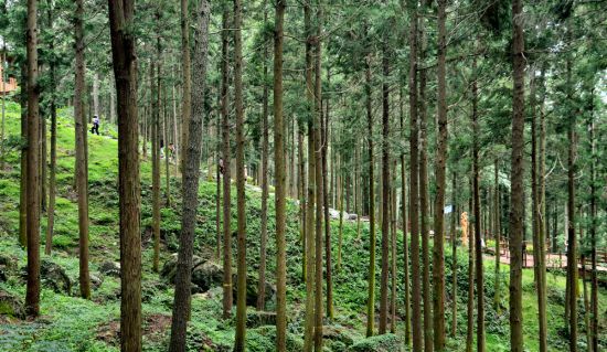 억불산 편백숲을 걷고 있는 여행객들 |