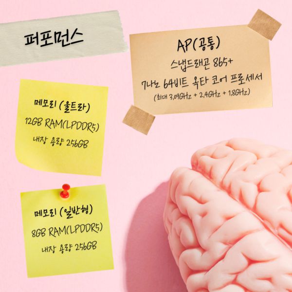 반면 일반형은 1200만 화소 초광각, 1200만 화소 광각, 6400만 화소 망원 렌즈로 화소수가 조금 떨어진다. 최대 줌 배율도 울트라는 50배, 일반형은 30배로 차이가 난다. 전면 카메라는 동일하게 1000만 화소 카메라를 장착했으나, 일반형의 '펀치홀' 크기가 더 크다.