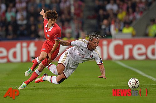 【에인트호벤=AP/뉴시스】박지성(32·왼쪽)은 21일 오전 3시45분(한국시간) 네덜란드 에인트호벤의 필립스 스타디움에서 열린 유럽축구연맹(UEFA) 챔피언스리그 2013~2014시즌 플레이오프 1차전 PSV에인트호벤과 AC밀란의 홈경기에 선발로 출전해 약 68분간 그라운드를 누비며 성공적인 복귀전을 치렀다. AC밀란의 필리페 멕세스를 따돌리고 돌파를 시도하는 박지성의 모습 |