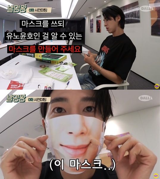 지난 11일 공개된 웹 예능 '발명왕'에서 유노윤호가 착용한 마스크가 눈길을 끌었는데요, 이 마스크에는 미소를 짓는 유노윤호의 하관이 인쇄돼 있었습니다.