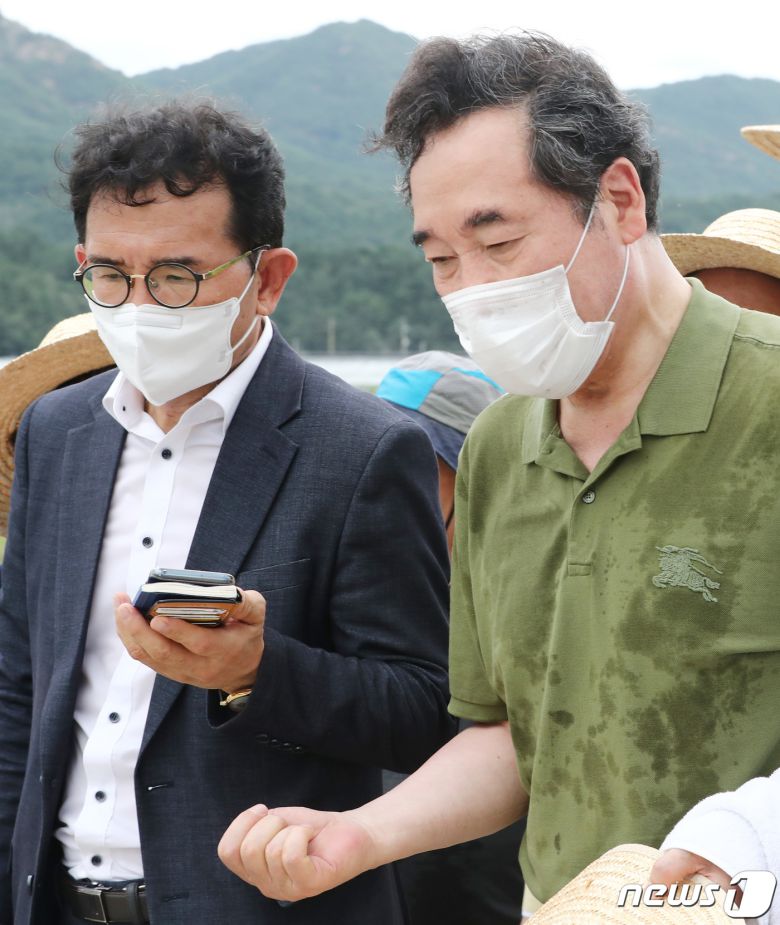 이낙연 더불어민주당 당대표 후보가 13일 오전 수해 피해를 입은 충남 금산 제원면 대산리 인삼밭을 찾아 복구 봉사활동을 마치고 뉴스1과 인터뷰를 갖고 있다. 2020.8.13/뉴스1 © News1 김기태 기자 |