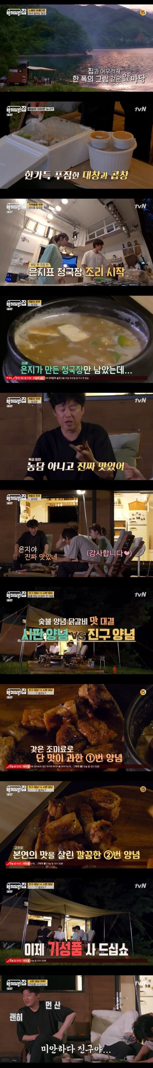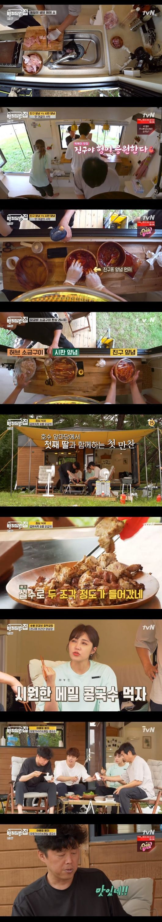 닭을 재운 후 성동일은 숯불에 먼저 소금 닭갈비를 올렸고 닭갈비가 완성되자 맛을 본김희원은 "형, 닭 가슴살이 이렇게 맛있네. 향이 그윽하다"라며 감탄했고 정은지도 "너무 맛있다"며 행복해했다. 이어 여진구와 정은지는 우뭇가사리&메밀 콩국수를 만들었다. 맛을 본 네 사람은 극강의 고소함에 "기가막히다. 아"라며 감탄했다.