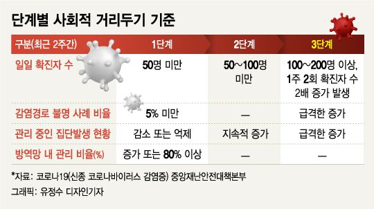 사회적 거리두기 2단계 기준은 △최근 2주간 일평균 신규 확진자가 50~100명 미만일 경우 △감염경로 불명 사례 비율 5% 이상 △관리 중인 집단발생 현황 지속적 증가 등이다.