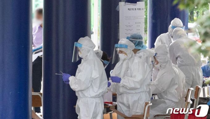 (용인=뉴스1) 이재명 기자 = 13일 오전 경기도 용인시 죽전고등학교에서 의료진들이 학생들을 대상으로 신종 코로나바이러스 감염증(코로나19) 검체 검사를 실시하고 있다. 해당 학교는 확진 학생의 가족 2명과 동급생 1명이 신종 코로나바이러스 감염증(코로나19)에 추가 감염됐다. 2020.8.13/뉴스1 |