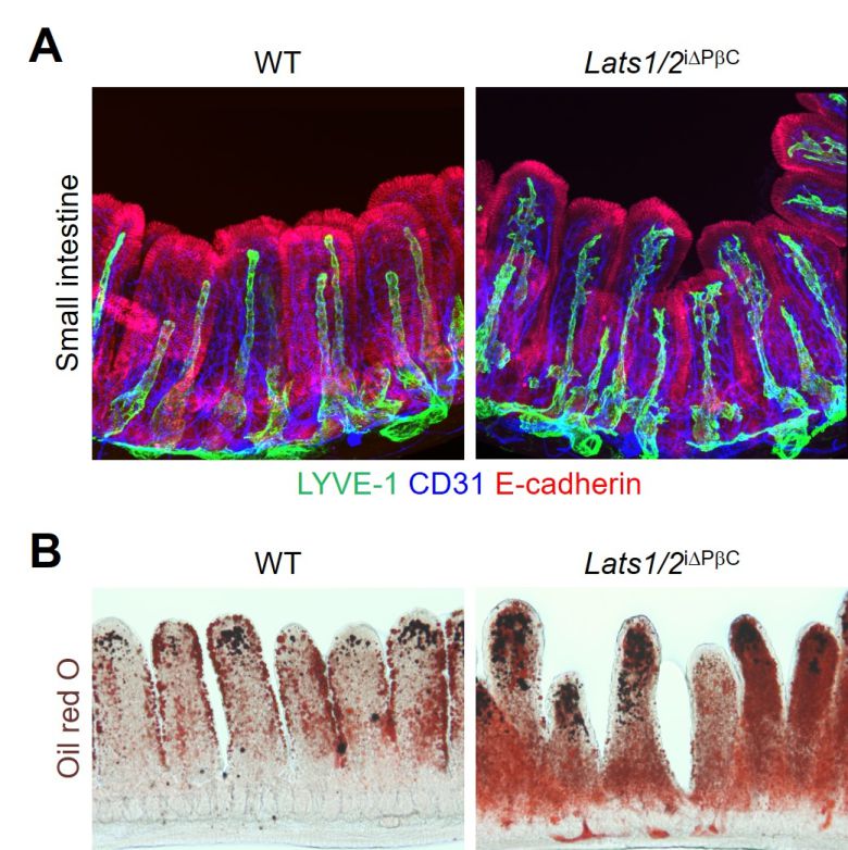 연구진은 암죽관에 주변 기질세포가 미치는 영향을 알아보기 위해 암죽관 부근을 관찰했다. 그 결과 다양한 기질세포들이 물리적 자극에 반응하는 히포 신호전달경로 물질인 ‘얍/태즈(YAP/TAZ)’단백질을 발현함을 확인했다. 얍/태즈를 과활성시킨 결과 림프관생성물질인 ‘베지에프-C(VEGF-C)’ 분비 증가로 암죽관이 비정상적으로 발아·증식해 지방 흡수 기능이 저하됐다. 반면 얍/태즈 발현을 억제하면 베지에프-C가 감소, 암죽관이 짧아져 지방 흡수 기능이 저하됐다. 소장 내 기질세포가 암죽관의 형태와 기능 조절에 핵심 역할을 한다는 의미다.