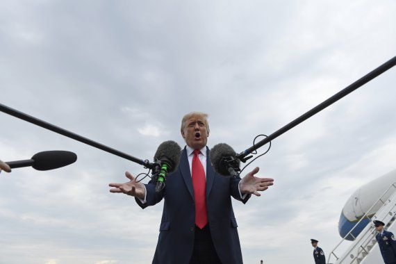 도널드 트럼프 미국 대통령이 14일(현지시간) 뉴저지주 모리스타운 공항에서 공군1호기에 탑승하기 전 기자회견을 하고 있다. 트럼프는 이날 러시아의 코로나19 백신이 성공하기를 희망한다고 밝혔다. AP뉴시스