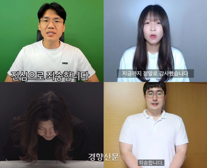 유료광고 표시 없이 ‘뒷광고’를 했다는 비판을 받은 유튜버(왼쪽 위부터 시계방향으로 보겸, 쯔양, 엠브로, 한혜연)들이 사과하고 있다. / 유튜브 화면 캡처 |