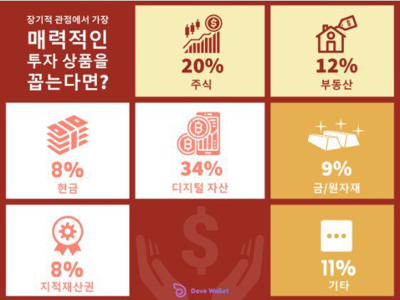19일 가상자산 금융 스타트업(창업초기기업) 차일들리는 자사 가상자산 지갑 '비둘기지갑' 사용자 6815명을 대상으로 진행한 설문조사에서 전체 응답자의 34%가 가상자산을 가장 가치있는 장기 투자상품으로 꼽았다고 밝혔다.