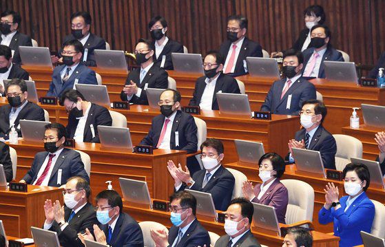 제21대 국회 개원식이 열린 지난달 16일 국회 본회의장에 출석한 여야 국회의원들이 모두 마스크를 착용하고 있다. 임현동 기자