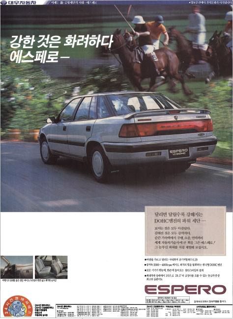 대우차가 현대차 쏘나타의 대항마로 내세운 에스페로는 날렵한 디자인으로 인기를 끌었습니다. 1993년 에스페로 TV 광고를 보면 ‘에어로 스타일’ ‘최고속도 시속 185㎞’ ‘ABS(브레이크 잠김 방지 시스템) 채택’ 등의 홍보 문구가 자막으로 나옵니다. ‘미스 에스페로’ 장미호씨가 광고 모델로 등장하기도 합니다.