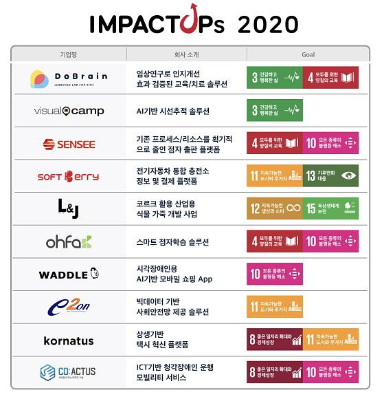 SK텔레콤은 지난해부터 우수 기술력을 보유한 스타트업이 사회적가치 실현 및 비즈니스 성장을 동시에 이룰 수 있도록 지원하는 임팩트업스 프로그램을 운영 중이다. 1기 11개사는 UN 지속가능발전목표를 연계한 사회적가치 목표를 설정하고 관련 사업 아이템을 발굴했다.