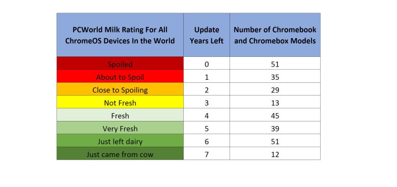 구글은 지원 사이트에 크롬북의 만료기한을 공개한다. PCWorld는 특정 크롬북이 만료되는지 확인하기 위해서 각 크롬 OS 기기 제조업체를 파고들지 않도록 모든 개별 장치의 목록을 수집해 만료 일자별로 정렬했다.