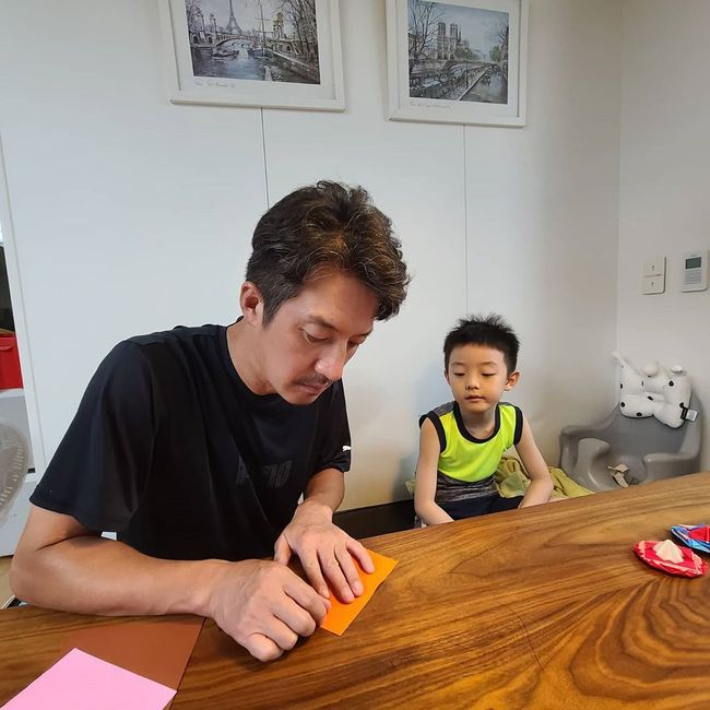 사진에는 테이블에 앉아 종이 접기를 하고 있는 시욱 군과 정준호의 모습이 담겼다. 시욱 군이 종이 접기 시범을 보인 뒤 정준호가 따라하고 있는데, 마치 선생님과 학생 같은 모습으로 웃음을 자아낸다.
