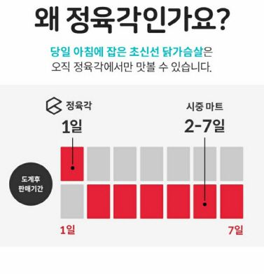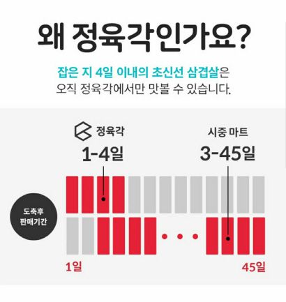 정육각은 도축한 지 4일 이내 되는 고기만을 판매합니다. 보통 마트를 비롯해 시중에 유통되는 고기의 법정 유통 기한은 45일 가량이라고 합니다. 도축한 지 40일이 넘은 고기를 먹을 수도 있다는 것입니다.