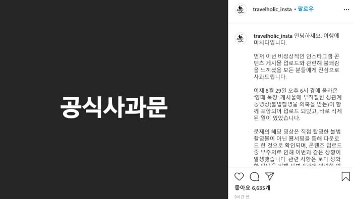 결국 여행에 미치다는 2차 사과문을 올려 “지난 29일 오후 6시쯤 올라온 ‘양떼 목장’ 게시물에 부적절한 성관계 동영상(불법 촬영물 의혹을 받는)이 함께 포함돼 업로드됐고 바로 삭제된 일이 있었다”며 “문제의 해당 영상은 직접 촬영한 불법 촬영물이 아닌 웹서핑을 통해 다운로드한 것으로 확인되며 콘텐츠 업로드 중 부주의로 인해 이번과 같은 상황이 발생했다”고 밝혔다.