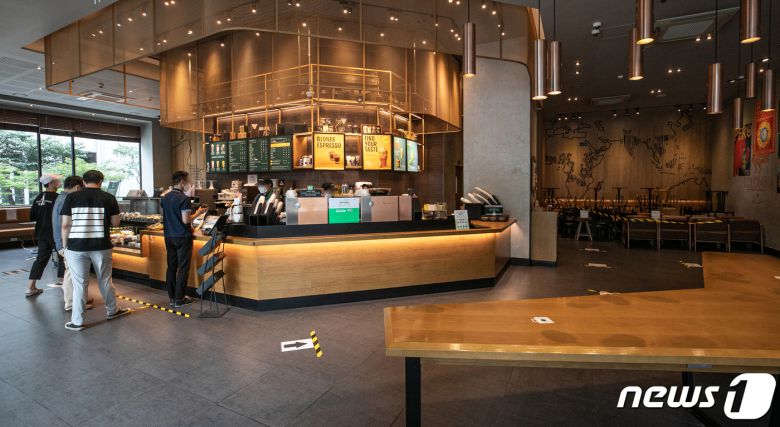 (서울=뉴스1) 이승배 기자 = 수도권 지역의 신종 코로나바이러스 감염증(코로나19) 확산을 막기 위해 사회적 거리두기 2.5단계 조치가 시행되고 있는 31일 서울 시내의 한 프랜차이즈형 커피전문점을 찾은 시민들이 음료 주문을 하고 있다.