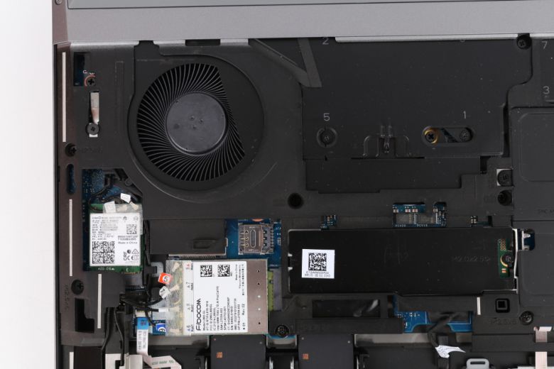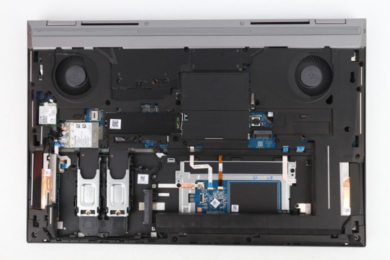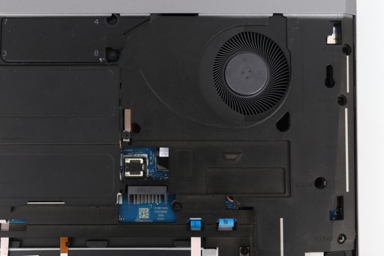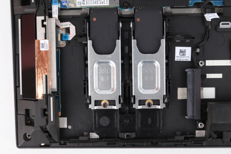 노트북 내부에는 업그레이드 슬롯이 많은 편이다. 메모리 슬롯은 4개가 지원된다. 이를 통해 최대 128GB로 구성할 수 있다. 스토리지 슬롯은 2개의 M.2 SSD 및 SATA 슬롯이 제공된다.