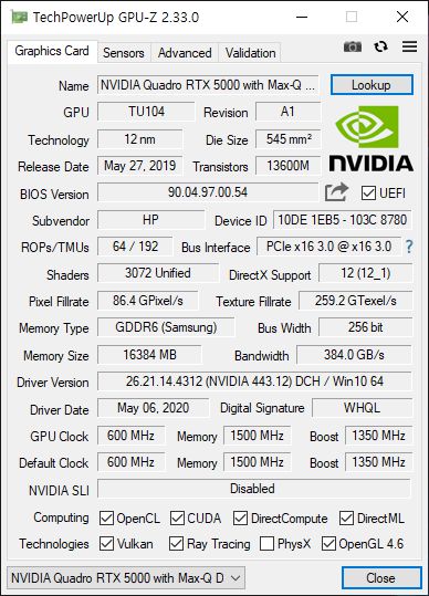 그래픽카드는 쿼드로 RTX 5000이 탑재됐다. 전작 ZBook 17 G6도 플래그십 제품군의 경우 쿼드로 RTX 5000이 탑재된 제품이 있었기에 이는 커다란 변경점은 아니다.