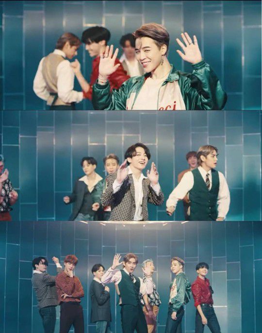 지민은 "우리가 '무한도전'을 너무 좋아했다. 뮤직비디오 찍기 전에도 항상 봤다. 총 쏘는 밈은 우리 사이에서 화제였다. 서로 총 쏘는 포즈를 많이 했다. 뮤직비디오에 쓰리라고는 생각하지 못했다. 우리끼리 웃자고 한 건데 B사이드로 나와 재밌었다"고 했다.