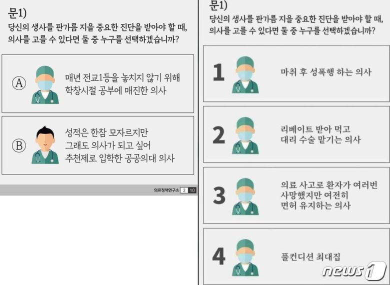 다른 질문은 "두 학생 중 나중에 의사가 돼 각각 다른 진단을 내렸다면 누구 의견을 따르겠느냐"는 것이었고, '수능 성적으로 합격한 일반의대 학생'과 '시민단체장의 추천을 받아 시험을 치르지 않고 입학한 공공의대 학생' 중 하나를 고르는 방식이었다.
