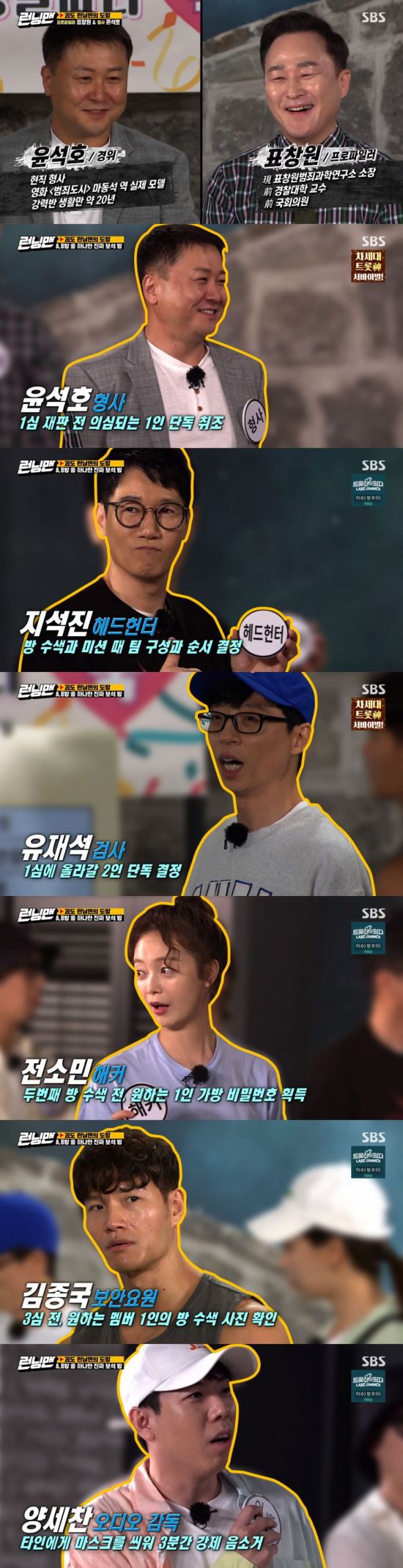 이날 '런닝맨'은 '괴도 특집 2탄'으로 진행됐다. 게스트로 국내 프로파일러 1호인 표창원과 마동석의 '범죄도시' 실제 모델인 윤석호 형사가 등장하자, 멤버들은 "진짜가 나타났다"며 감탄했다.