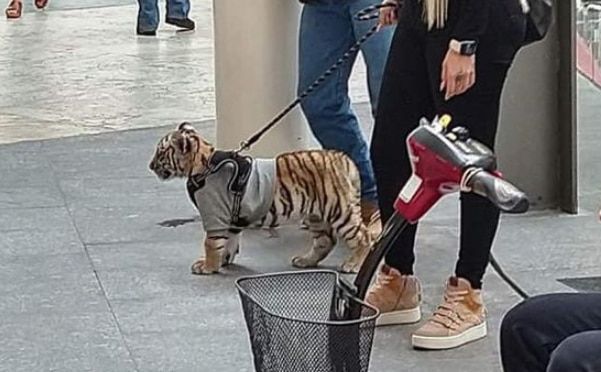 멕시코의 한 쇼핑몰에서 젊은 여성이 목줄을 맨 새끼 호랑이를 마치 애완견처럼 데리고 나온 모습이 포착됐다. 호랑이와 같은 야생동물을 개인이 키울 수 있는지 등을 두고 논란이 거세지고 있다.