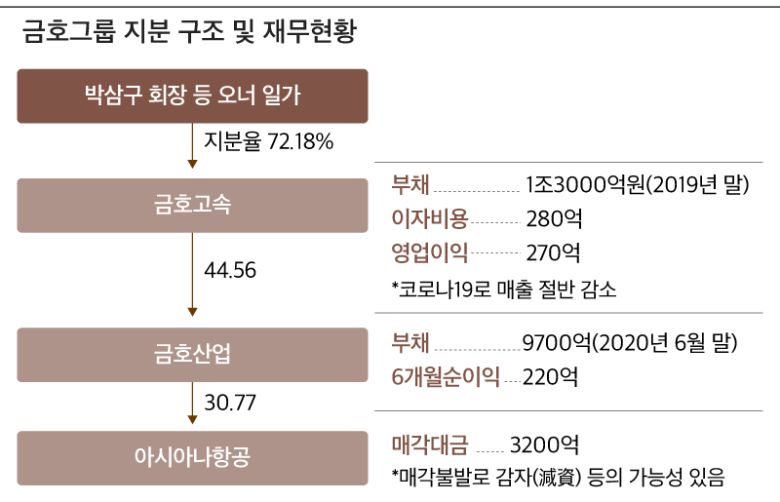 아시아나항공 매각 무산으로 그룹 해체 가능성까지 제기되는 가장 큰 이유는 그룹 지배구조의 정점에 있는 금호고속의 재무상황이 좋지 않기 때문이다. 금호그룹은 ‘금호고속→금호산업→아시아나항공’의 지배구조를 갖고 있다. 금호산업과 금호고속은 각각 자회사인 아시아나항공과 금호고속 지분을 담보로 대규모 차입해왔다. 금호고속이 금호산업 지분을 담보로 1300억원을 빌린 게 대표적이다. 금호고속의 재무 위기를 타개하기 위해서는 금호산업이 아시아나항공 지분 매각 대금을 확보했어야만 구조다.