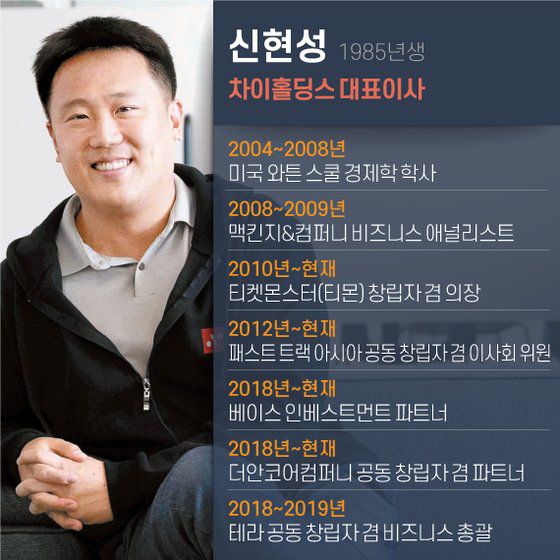 그리고 10년이 지났다. IT업계 창업 1세대인 이해진 네이버 글로벌투자책임자·김범수 카카오 의장 등이 한 기업을 키우는 데 주력한 것과 달리, 창업 2세대인 신 대표는 티몬의 울타리를 넘어 '연쇄 창업가'의 길로 들어섰다. IT 벤처 투자회사 패스트트랙 아시아, 컴퍼니빌더 더안코어컴퍼니, 블록체인회사 테라, 간편결제 서비스 차이(CHAI) 4곳에 공동창업자로 이름을 올렸다. 지금은 차이홀딩스 대표로 한국과 아시아 지역 결제시장을 노리는 중. 지난해 6월 서비스를 시작한 차이는 1년 2개월 만에 국내 가입자 200만 명, 누적결재액 8300억원을 달성하며 간편결제 시장의 다크호스로 주목받고 있다.