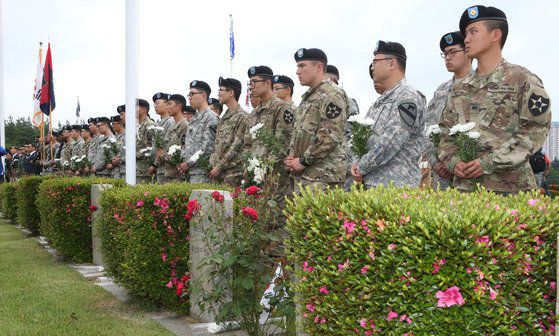2016년 6월 6일 제61회 현충일을 맞아 미8군 제2보병사단과사단법인 대한민국카투사연합회가 함께 부산 남구 UN기념공원에서 '낙동강 전투 전승 기념행사 및 카투사 전몰용사 추모제'를 개최했다. 행사에 참가한 시어도어 마틴 당시 주한미군 2사단장(소장·왼쪽)이 참배하고 있다. [중앙포토] |
