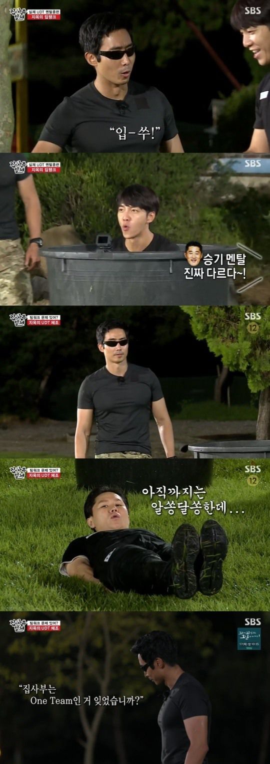 이에 이승기가 손을 들었고 거침없이 딥탱크 안에 들어가 입수했다. 이근 대위는 이승기에게 "머리부터 발끝까지"라고 말했고 이승기는 다시 입수했다. 이근 대위는 "일체가 무슨 뜻인가. 한 몸이라는 뜻이다. 왜 안들어가는가"라고 멤버들에게 물었다. 양세형은 "개인주의라서 그렇다"라고 재치있게 답했으나 멤버들은 이승기를 따라 다 같이 입수를 했고 1분을 버텼다